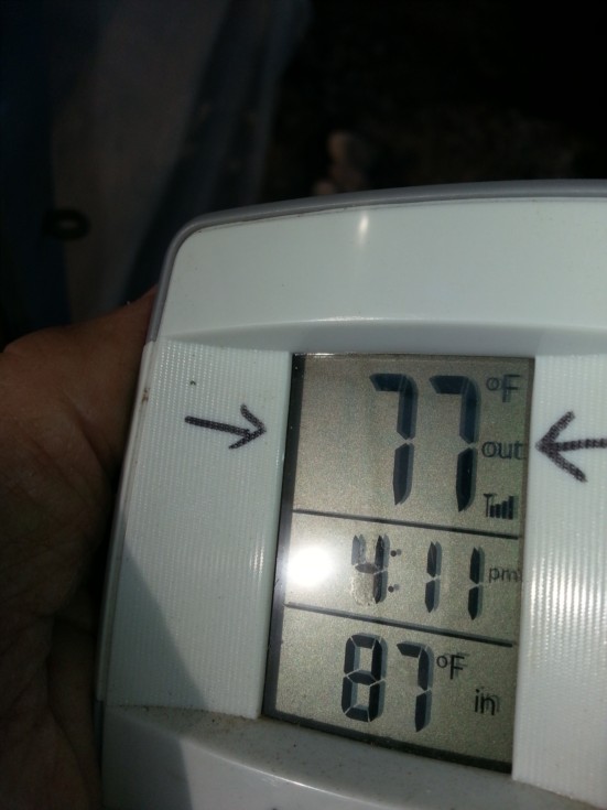 Temp this afternoon in tunnel 1 about 4pm. Upper number is sensor temp at plant level, in full shade. Lower number is main display temp...its sitting on a cross member in the sun....so it reads high.