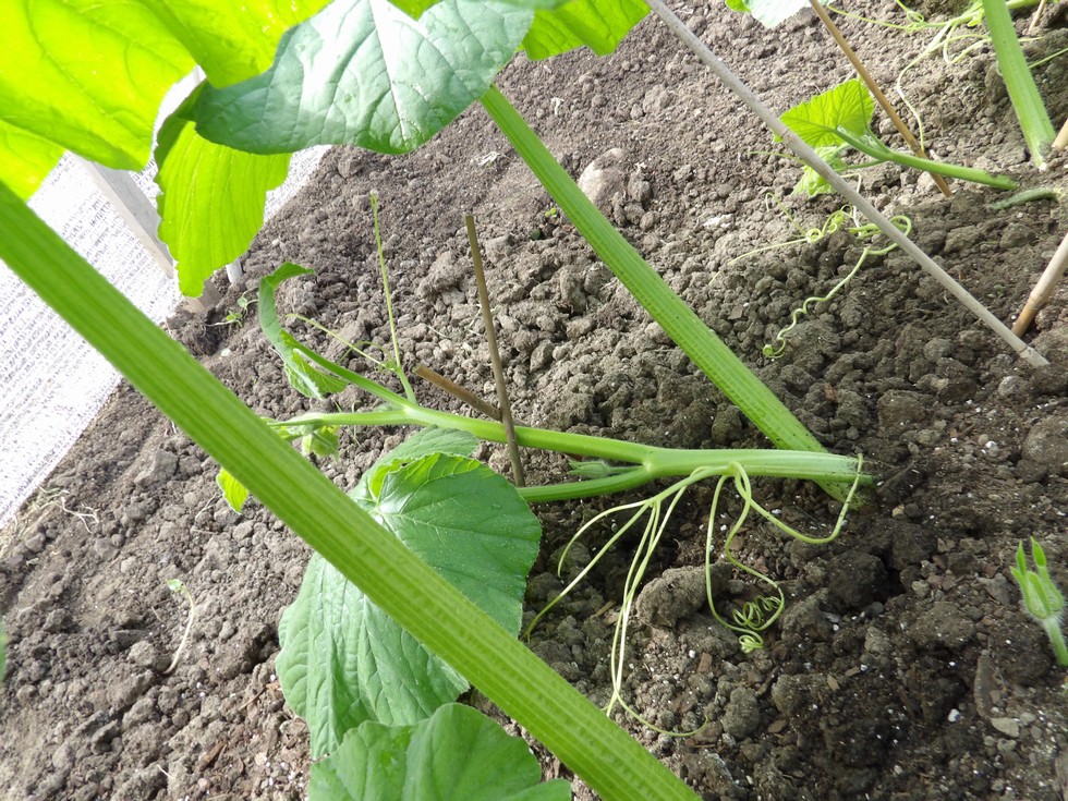 For those wondering how we train and pin down the vines. This is a side getting gently moved to the position we want it. This also helps keep the plant from getting rolled in a stiff wind, but wind breaks at this stage is critical. We had 54 mph winds about 10 miles north and west of us today, but given past experiences, the shade cloth we have up will work in 70 mph wind and not harm the plant. It may not be pretty, but it is effective.