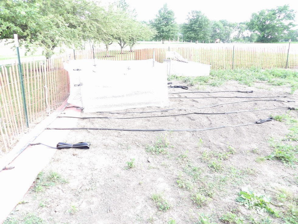 the 1566 is finally starting to lay down and its too hot for the cold frame, so it got its wind fence and shade/hail net installed today along with the watering system for it too.