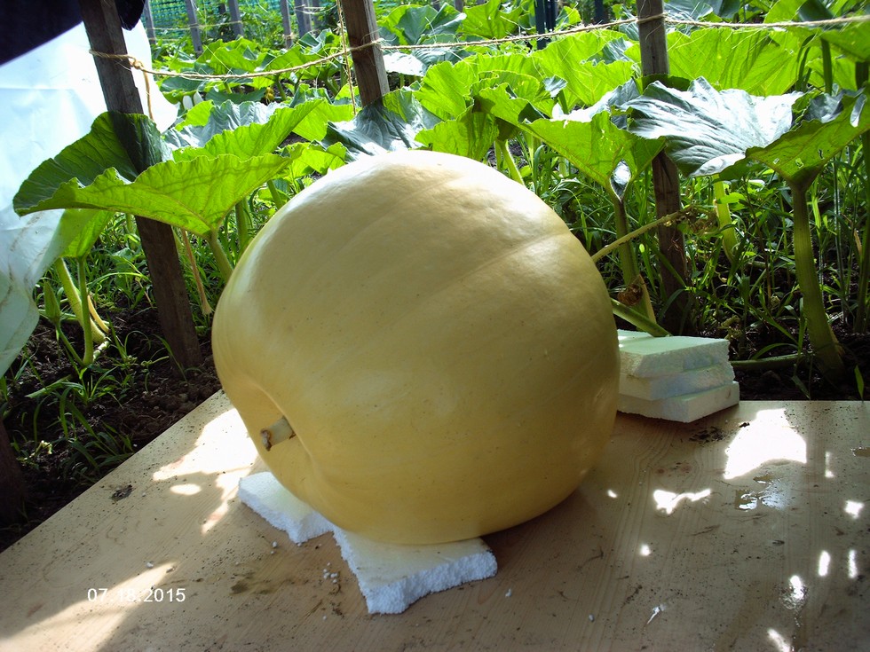 Rocky's Dap 18: 56"cc. Started to pull more on the main vine, so I put foam under the blossom end to raise this end up to release the stress on the vine. I will need to adjust the main vine again pretty soon.