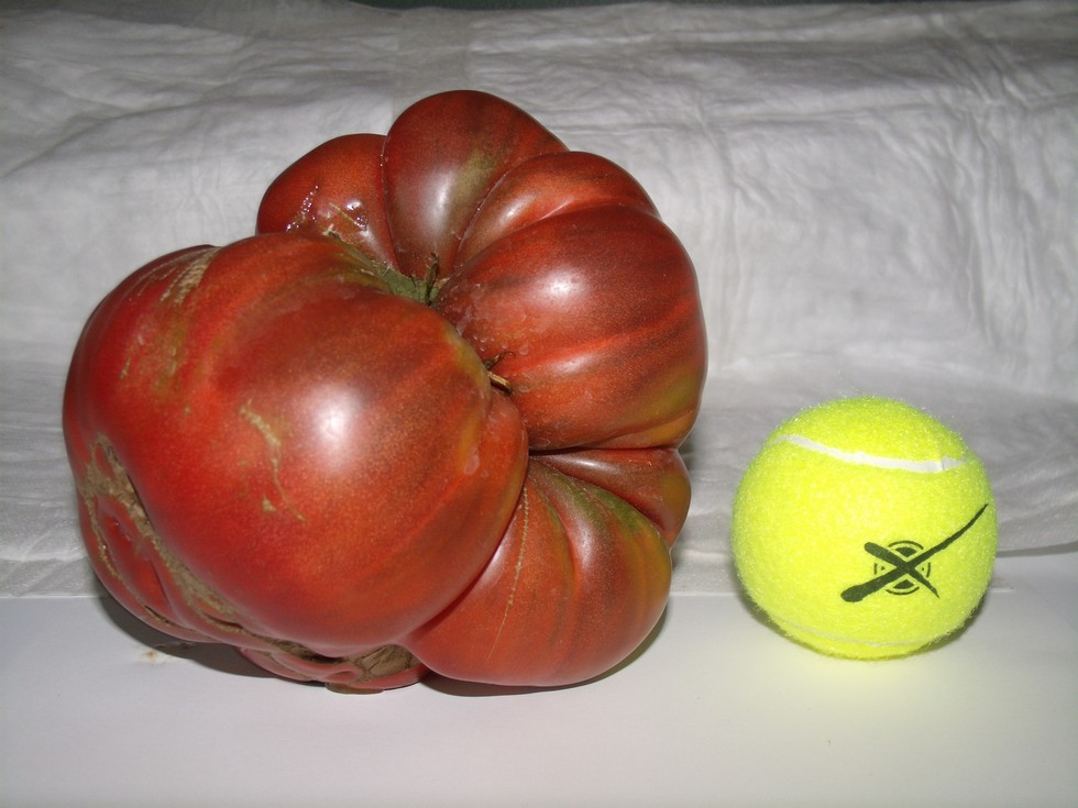 This was from a mega bloom on a Black Krim tomato. I weighed it with a Rapala electronic fish scale. It registered 2.94lbs. I registered a different tomato on a certified scale and the fish scale was .49 lbs. light. So this might have weighed 3.43lbs. Not bad for being grown with other tomatoes on the plant and with no pruning.