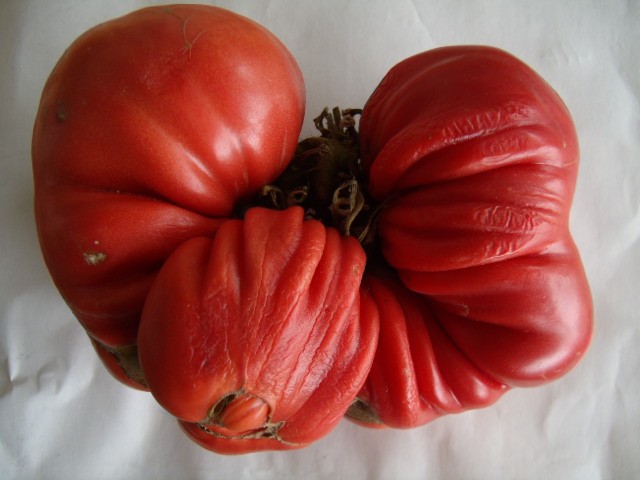 This wrinkled tomato was knocked off of the 8.41 MacCoy when it was green. It was about a pound. I put it in the potting shed and it ripened. I�ll see if the seeds are viable. Lesson learned, put a support under each tomato.