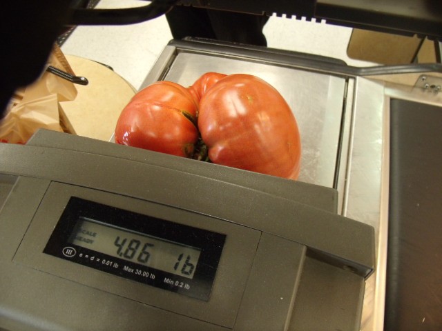 4.86 Not bad for first year. I�m happy. This one was on the 5.3 MacCoy. The ground squirrels took a bite off the bottom. I�ve live trapped seven so far this year. I will have to find a way to protect the tomatoes next year.