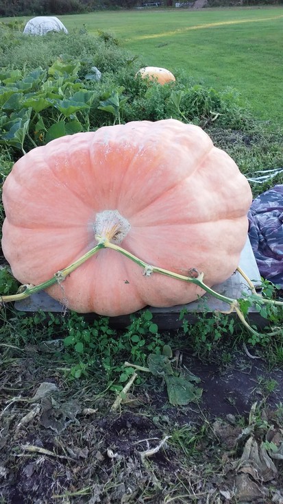 1710 Breznick pumpkin pollinated with the 2102 Meier last measurement was taping 775 lbs