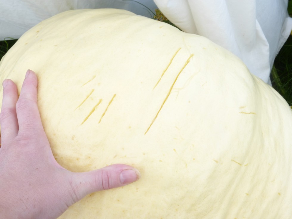 This is what happens (I think!) when there is too much rain...the joys of outdoor growing and being at the mercy of the (Great) British weather! I'm gutted...at DAP 55 and splits....they are only about 2 mm deep but the longest one is pictured here on the shoulder of the pumpkin.