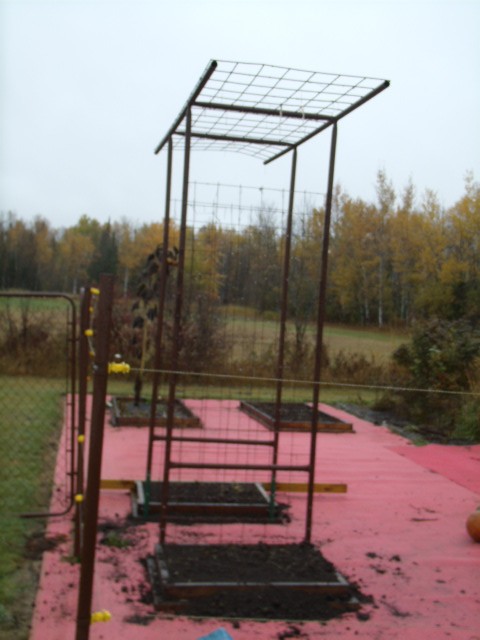 This is a tower I made to grow Long gourds on. I fastened it to the raised beds on each side of it. It was covered with vines and had starting to grow gourds. A strong wind came up and tipped it over. It now has a three foot anchor at each foot. I will try to get seeds and grow them next year. The sunflower in the back is a 22Berry2011. I have six seeds left and will save these seeds. Was only 9 feet, about the same as my mammoth seeds. I will try harder next year.