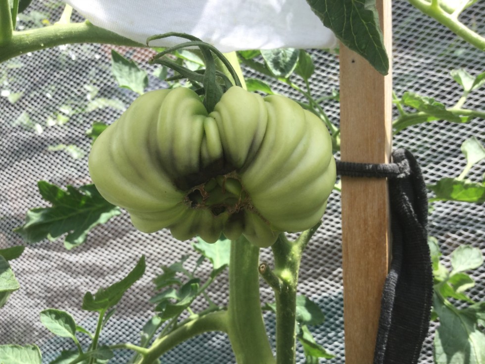 Domingo (5.75 Porkchop 2014) C, now has blossom end rot. Only the domingos have been struck with BER and 2 of 2 fruits have it... This one got hit on DAP 7, a couple days after all growth was terminated. The rot looks pretty deep too...pretty pissed off about it