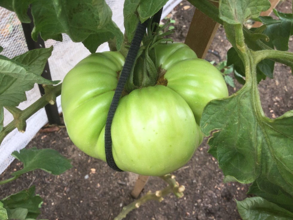 Very good looking one on Delicious. This plant has been hit very hard with blight (blight has struck very very early this year compared to other years). Guessing it weighs close to one and a half pounds right now.