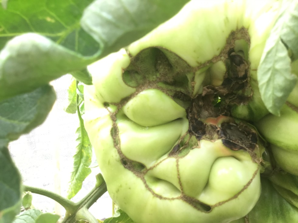 Bottom of one segment...pretty gnarly...there was a strange split/hole that goes through the whole tomato (light in the middle of the tomato is the other side). It suddenly appeared a while ago. Also a slight blush appearing near a part of the blossom end rot. It appeared midday on a 44C degree (111F) day but hasn't spread since the temperature became 16C (61F) within 24 hours from being 44C. The sudden change caused all plants that had all growth terminated get psychological leaf curl.
