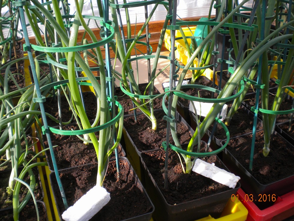Exhibition Onions just potted on into 5inch pots with two support canes, again in the growth cabinet under 10.5 lights.
