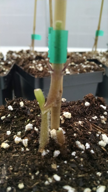 Step three about four days later. I completely removed scion from its original roots. And banded the plant to a bamboo stick for stability. Also I removed the top of the plant above where the cotyledons were. This will send out two leaders.