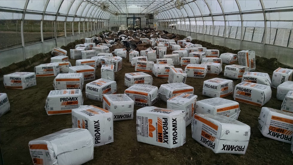 Last fall I removed 8 to 12 inches of the topsoil from the greenhouse. It is was sandy loam from a riverbank next to the greenhouse. I had a lot of trouble with fertilizer leaching right through it last season. So I spread 240 bails of promix hp, 5 dump truck loads of cow manure (came from cows that were not given dewormer), 50 pounds of granulated sulfur, 1000 pounds of worm castings (that included 8000 to 10000 red wigglers, and 2000 to 3000 European night crawlers), and brought back in 50% of the sandy loam.
