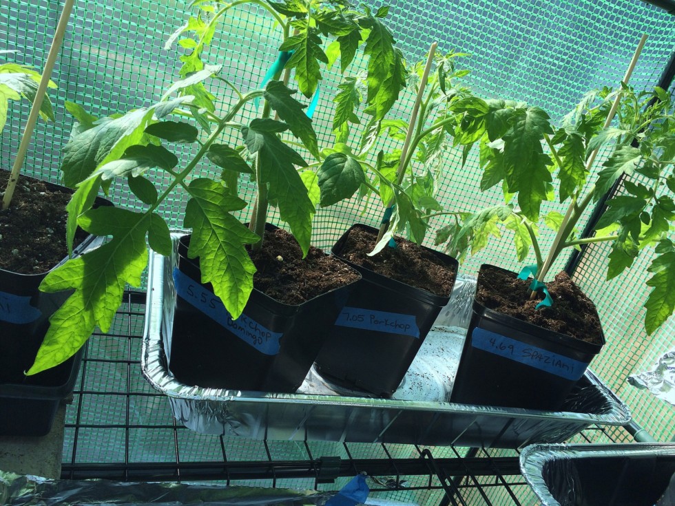 This is the 5.55 Porkchop Domingo, 7.05 Porkchop, 4.69 Spaziani after 5 weeks of seeds starting. I already cut the lower leaves and transplanted the main stem deeper in the soil two weeks ago. There are roots already coming out the bottom of the pot. The weather has been one month ahead of schedule and if it holds, I will put them in the garden by the first week of May.