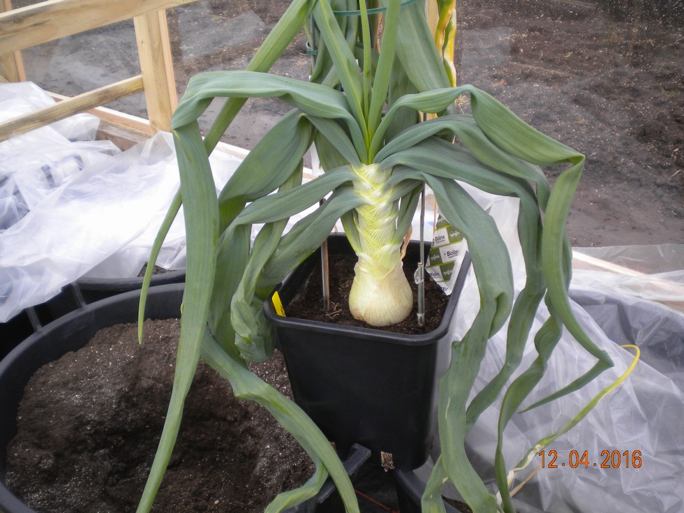 Planted out the last giant Onion in my new frame, never planted one out of such a large pot, even so found the plant was severely pot bound, will have to see how it grows away. 9.5inches high x 11.5 circ. 15 green leaves.