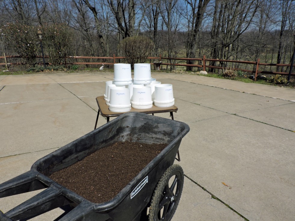 Time to fill the 2 gallon pots with the special seed starting medium. (It's a secret, but go tell a................never mind! That's someone else's line!)