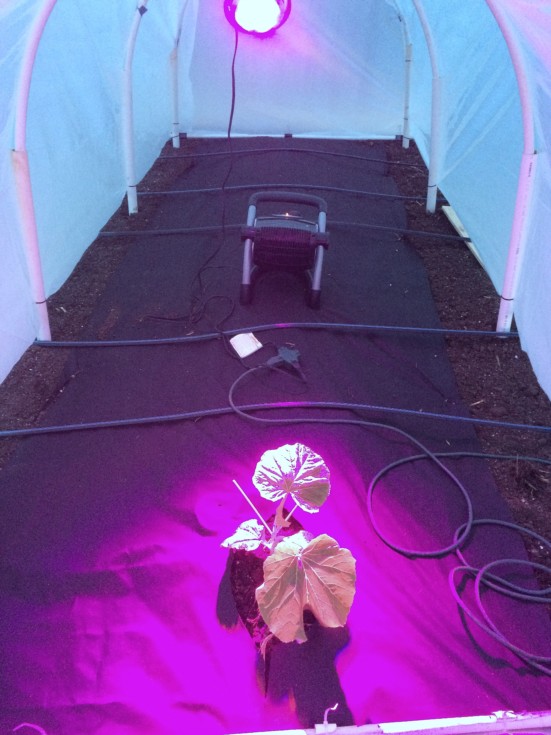 1921 Weston in the hoop house with heater, blue and red LED light, on timer.