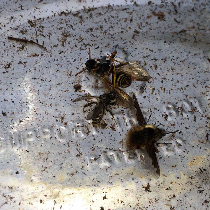 I went back to the green house and found these bugs in the tray my plant was sitting in. One looks like those hovering yellowish horse fly's, a wasp, and some other unidentifiable bee. I know some wasp like bees inject eggs into living tissue and hatch larva. Anyways, things were going so well. That's why I have a couple of backups. They look to be unaffected. Any other ideas, please let me know. Never had anything eating out my stems before.