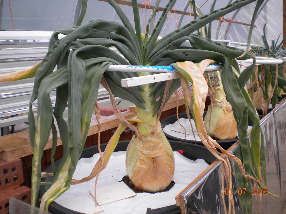 Lot 2 Onion has grown steadily during June, now 19.5 inches high x 26.3 circ. 19leaves. Some die back on the leaves and beginning to look tired even though the weather remains cool/dark. Thrip & spidermite predators renewed this month.