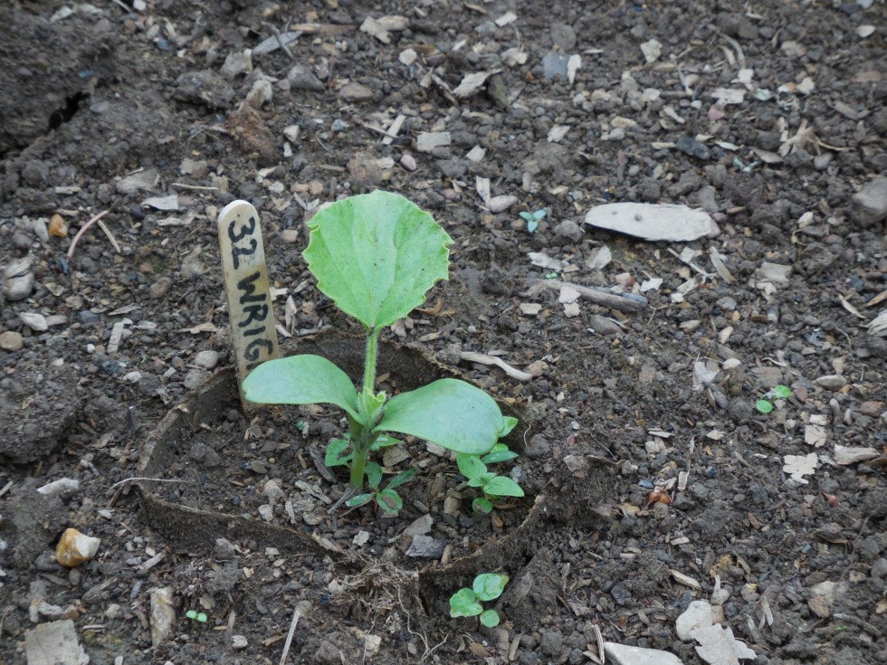 Cantaloupes showing a first leaf. Growing fast.