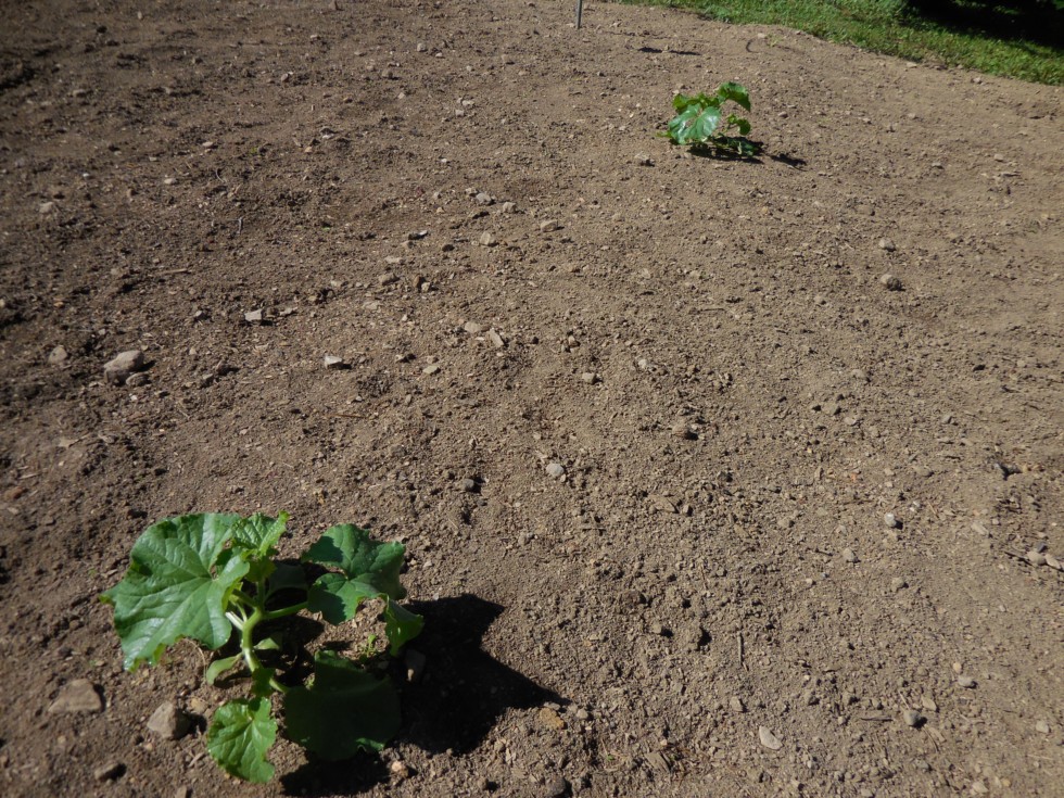 Cantaloupes growing well, except I lost one plant on the end of the row. Something broke the stem. Maybe one of the cats? Planted a back-up that was in the trash pile. A 35.5 Bright plant. The other 2 plants are from a 32 pound cantaloupe I grew a few years ago.