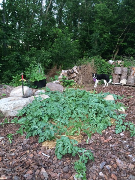 Lily is on chipmunk patrol around the watermelons... She is very good about not walking in the gardens...need to make a sign for these...each plant has had a baby weenie flower but they were really little and I don't think they took... I know nothing about these but am hoping there's still time... I would totally be happy with big grocery store size ...