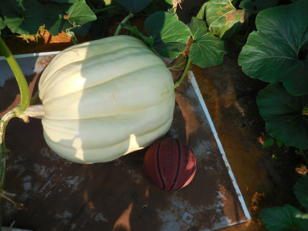 Twin # 2. Both pumpkins were pollinated about a day apart (open), somewhere around July 4. Again, we feel very blessed to be getting anything off this plant. Much less a pair of "Twins".