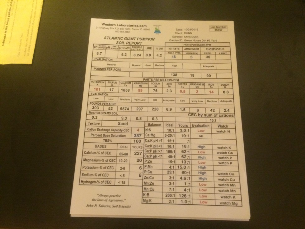 I found this pretty interesting. This is the soil test for the 90 yards of dirt I filled the greenhouse with. I'm not use to such low numbers but this is what I'll be aiming for from now on. My 1756 is day 35 today and taping 338 OTT and 859 pounds. Light years ahead of anything I've ever grown!! She's been well above 40 pounds a day for 15 days now and averaged 49 a day over the past 5 days.