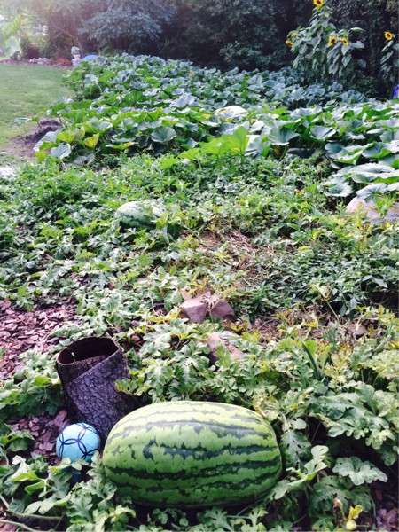 The melon plants are on their way out... One of them is anyway...still good green leaves heading to King Arthur ...est 116lbs...growing a couple pounds a day...one of my favs this year...I'll need to learn a good spray program and how they should be fed...these got ferts about 5 times....I think with proper crap-filled planting holes this fall and a little more attention I think I could do a lot better w these...it's the biggest one I've ever seen w my own eyes...lol...hysterical