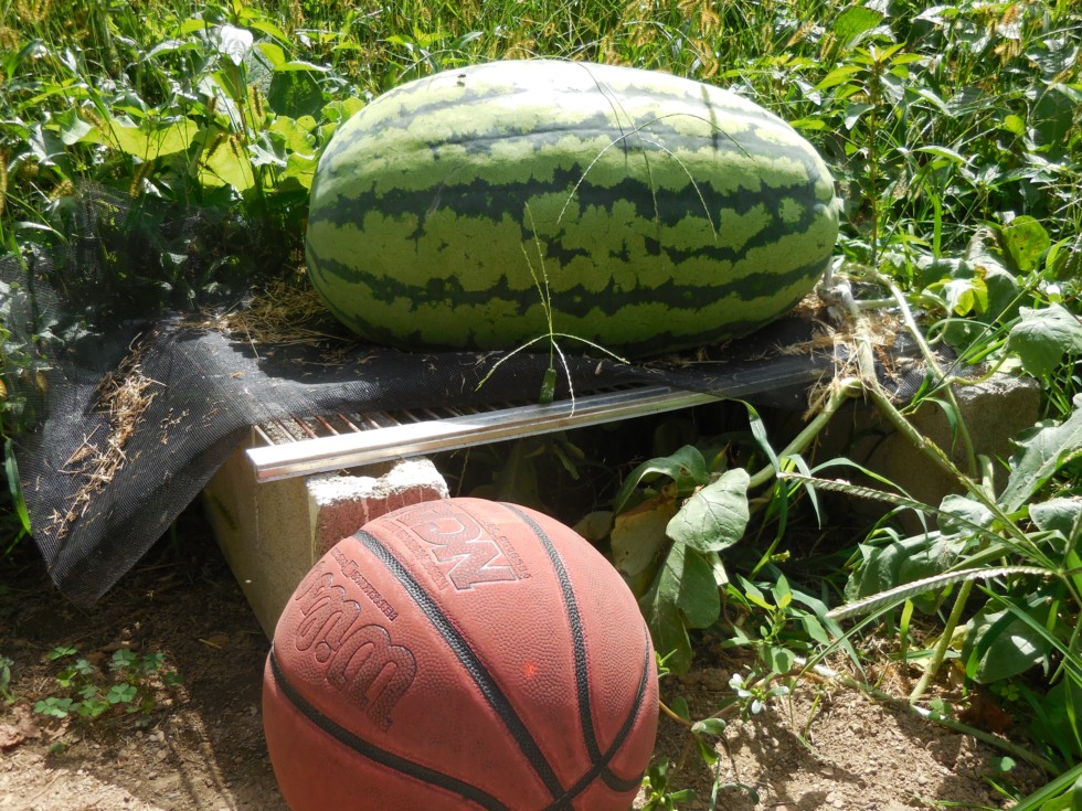 Our genetics watermelon. Just for future seed. There is another hiding in the weeds, just like this one.