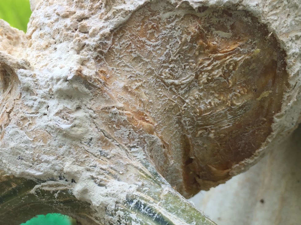I began to get some soft spots on the stem of my pumpkin despite the Captan paste I applied. The pic shows the appearance after I had excised the lesion, sprayed isopropyl alcohol & sprinkled sulfur dust on it.