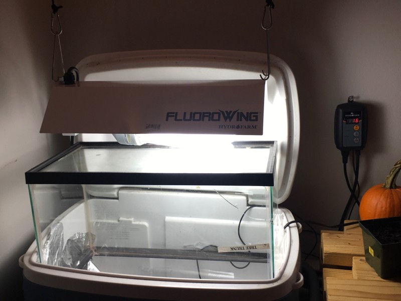 This is my setup. I put a germinating mat on the bottom of the cooler. I then put the seeds that where sprouting in some pots on the heater. I did not have an old window so I used this old fishtank to put on top and it's working. I set the temp at 84 so every time it goes above 84 the germination pad will shit off. Every time it goes below it will turn back on. The temp on the screen on the right says. 16. It's not really at 16 it just screws up when I take a pic I don't know why but everything is working