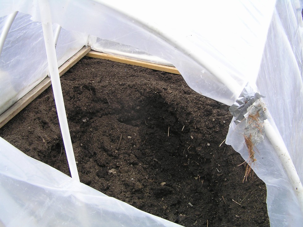 Inside each greenhouse the soil is warm and there's a 3 ft diameter x 2 ft deep planting hole. I hope this hole helps to worm the soil deep down. Tilled under the winter rye cover crop already.