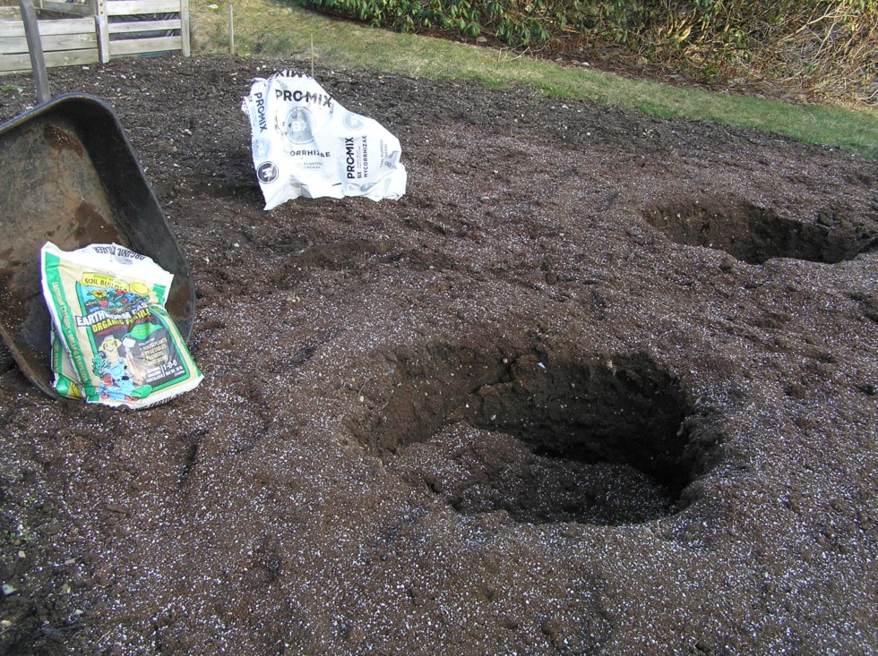 2 days of heavy Rain coming up , so I temporarily removed the 6ftx 10ft greenhouses and spread out some Worm Castings., Kelp and ProMix, around each planting hole. Will till it in in a couple days
