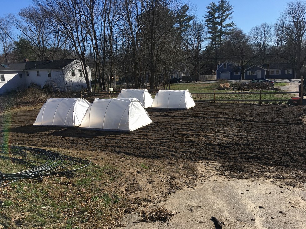 Hoops are rebuilt again for another year. This time in the patch and anchored down. Hopefully the new film will stand the test of time.