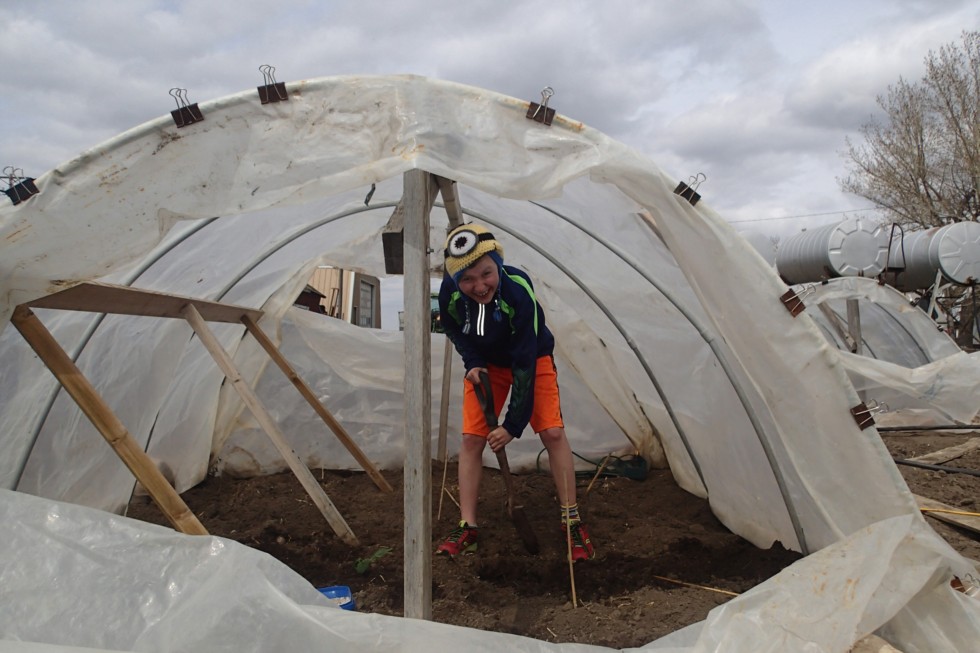 The main patch at the farm is now ready for plants. Alex is all ready for another season. His choices for seeds? He wants to see what he can do with my 965 Makarchuk squash, so in go two of the plants into his house.