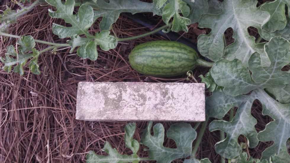 Same melon,different size comparison with a brick.Main vine, 2nd melon out on the runner.