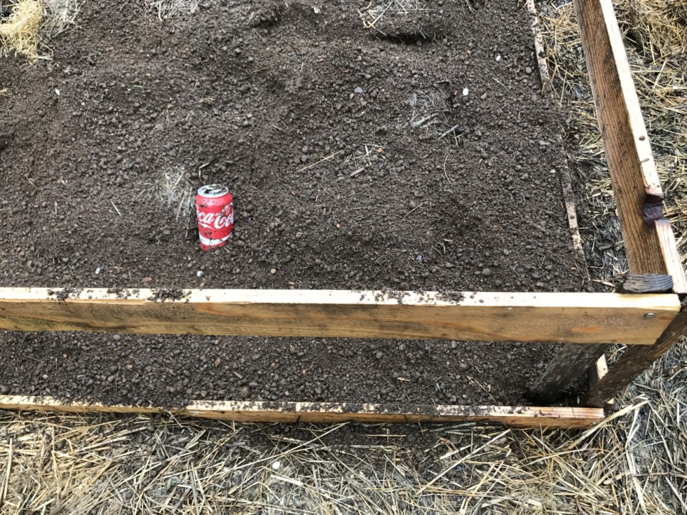 Covering hay with dirt. I planted about 5 lbs of small potato sets in all the gaps between the hay bales. A few are visible in the previous picture... if you look really close!! It took three entire rotted bales to cover the 150 sq ft, and around the perimeter also.