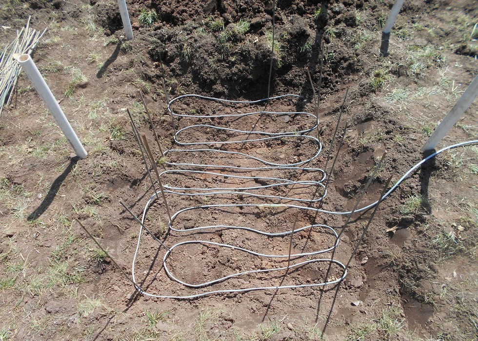 This is the pattern I use which allows the thermostat to be in-between two heating elements. Also, you want the thermostat to be level if not slightly above the heating cables to ensure accurate temperature readings. The pale gray cord between the thermostat and the plug is a non heating element so keep this in-mind. Also, I use bamboo stakes to help with the prevention of two heating cables from touching before covering with soil. These are the heavy duty cables and they have worked work out great over the years.