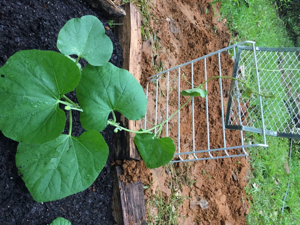 I have rigged up a small makeshift trellis for the unknown gourd that has already started vining. I will try to rig up something better soon, probably with chicken wire.