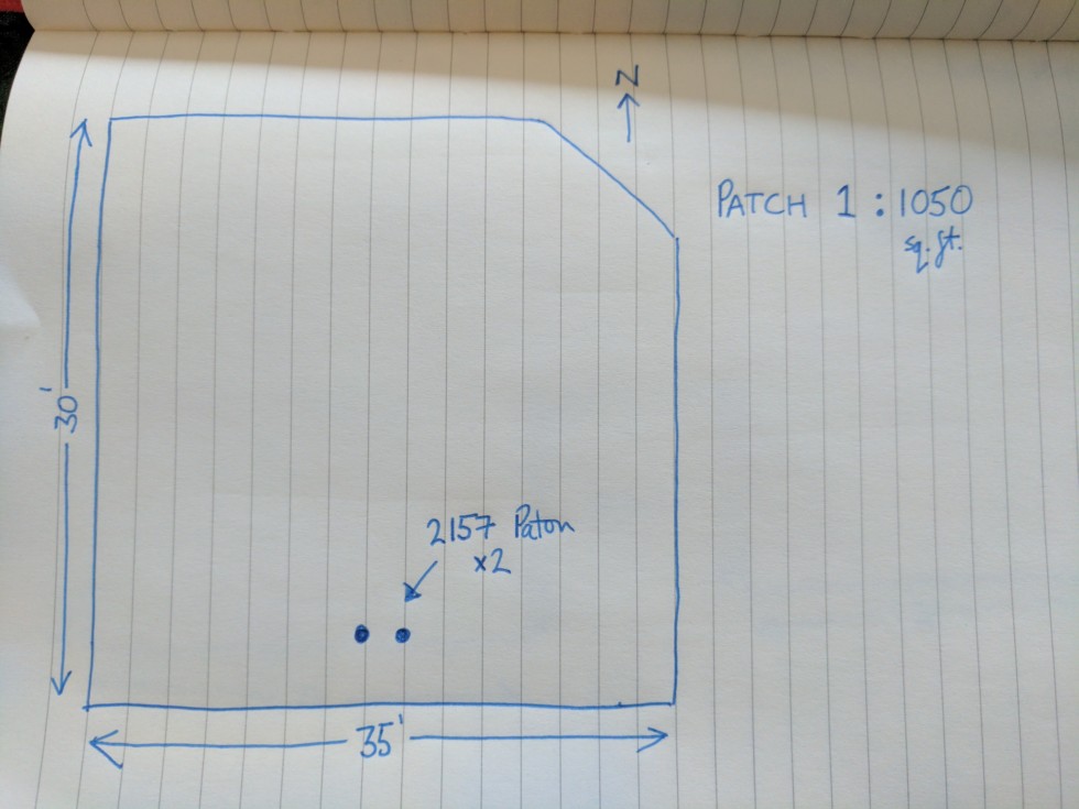 In February it was really warm and I cleared out a new patch. Here's a diagram of the layout. I've got two 2157 Paton in a heated greenhouse with 48' soil cables. The patch is around 1000 SQ ft and had a nice sunny exposure. The soil is about 12" deep until you reach sand. Soil test showed a pH of 5.8 so I added a bag of rapid lime. Also added 50lb of Northeast Organics 5-3-4 Pro Grow across the whole patch. Some 2-3-3 Pro Start closer to the planting holes. 8lb kelp. A little borax.