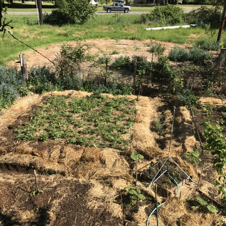 Potatoes coming along in one of the other 150 sq ft patches. (150 sq ft of potatoes). Im thinking as the pumpkin grows over the potatoes I will throw some sifted dirt on the pumpkin vines and it will help bury the potatoes too.