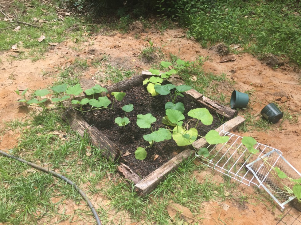 New garden looking healthy. I have just transplanted two more gourd plants, including a giant zucca gourd.