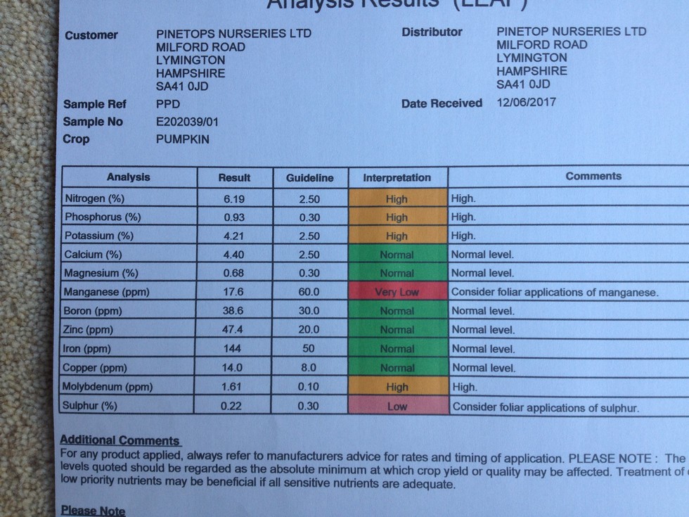 So here is out leaf sample. I told you pumpkins were pigs: look at the nitrogen. Manganese is a problem and despite Sulphur looking fine in the soil, like Ron, we are short it the leaf.