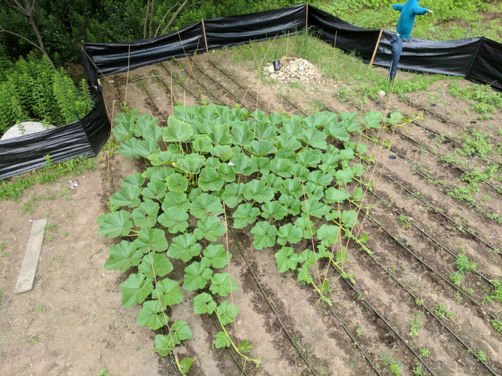 This is Patch 2b. I added some extra area to it and installed drip tapes. Each node has been buried with WOW Pumpkin Pro and Azos. The plant is a 2066 Geddes. Tomorrow it'll be the first pollination: Main vine at 11ft. Cross will be 2157 Paton.