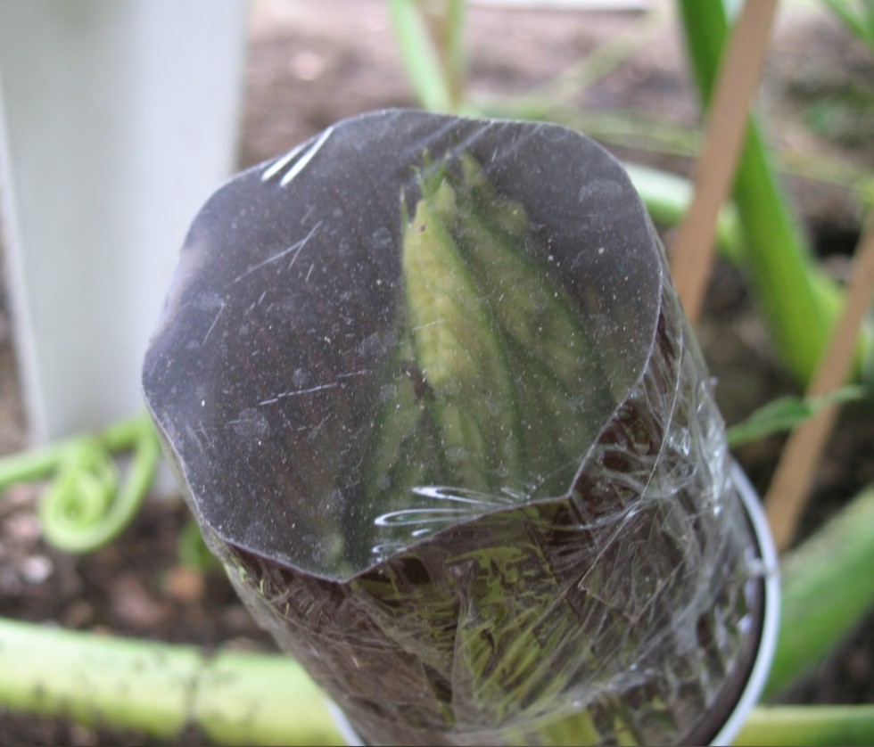 Here another View. This technique i used for many years and it works very fine. On the top a thin plastic sheet so the flower has some light. This flower will maybe open tomorrow midday(because it is very cold in germany).