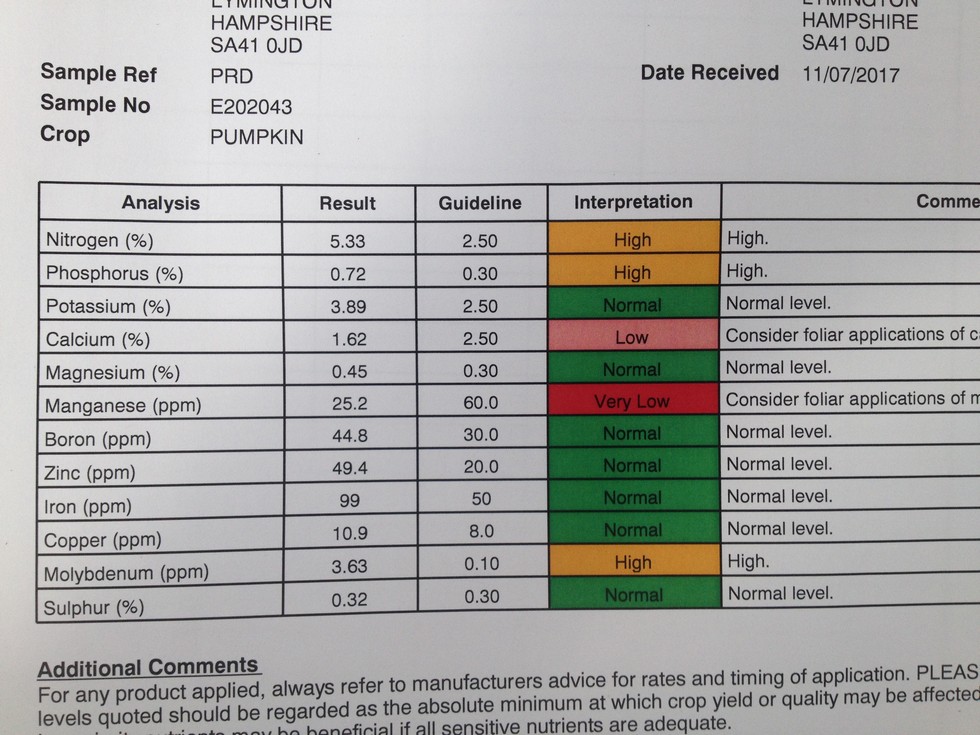 Just for interest here is this weeks leaf sample taken from in front of the pumpkin. As you can see the calcium is not making it past the pumpkin which is not really a surprise. We will have to get our head around the manganese next year.