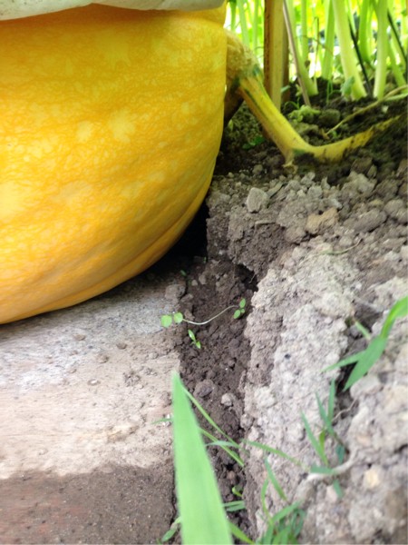 Hillside growing has its challenges, and as always, I'm out of room about a month into growing. One of these years I'll learn to set the board in further, I always have this problem because I try to save the roots at the pumpkin for as long as I can.