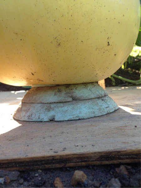 From a front view, at 6 DOC I moved her left of center on the cone and placed the thicker shim underneath. This has several thoughts behind it. It is the second reason that no adjustment was made yesterday. The thin side needs to catch up in girth, but won't do so until it hits the board and equal pressure is supporting the bottom, until then gravity is king and the heavy side will win. I believe this is a natural thing for pumpkins to develop more to one side than the other, so just working with Mother Nature here. By setting left for one day, the pumpkin has gripped the shim by sagging a little over top, and is now essentially stuck in place rather than being pushed out as it grows.