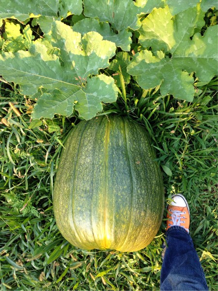 188 MacKinnon. I was only going to keep this plant for a pollinator but it was out-pacing the other pumpkin so I kept it. Just in the grass, not much plant behind it. 26 days old.