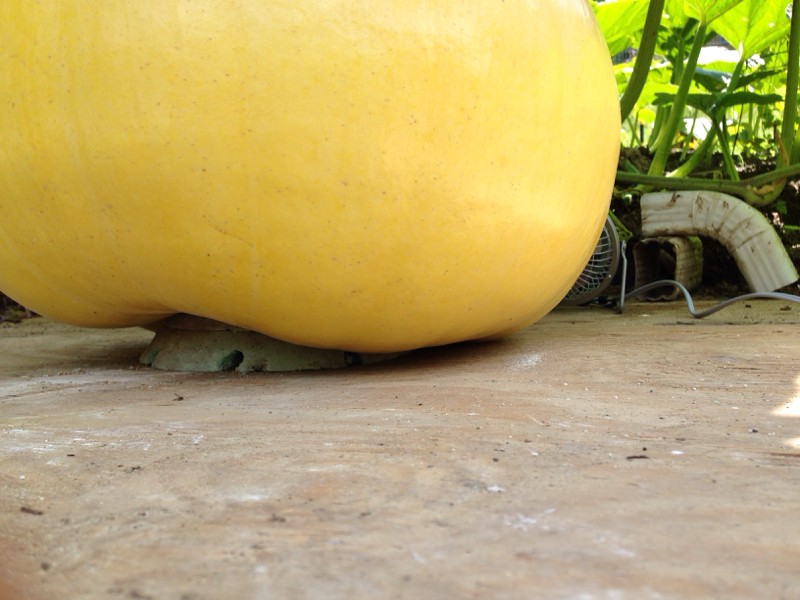 Right side shot, entire back of pumpkin touched today, hopefully the sides will have caught up by tomorrow, allowing a solid base until the front divot fills. I would have preferred the divot to be the back of the pumpkin, but again my vine got a little twisted when laying down.